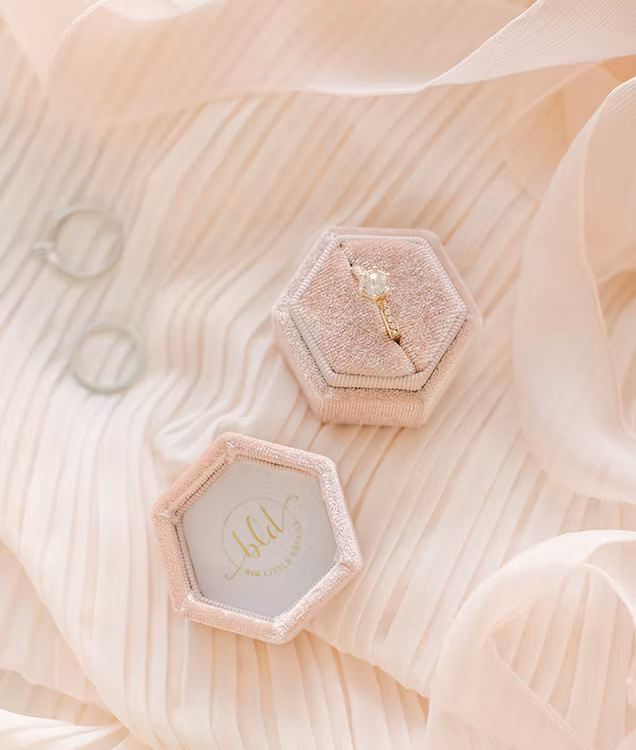 Handgjord ringask i rosa sammet med ett eller två ringfack. Våra ringaskar är mindre än traditionella ringaskar för att framhäva din ring på bästa sätt. En vacker liten detalj för bröllop, förlovning eller present.