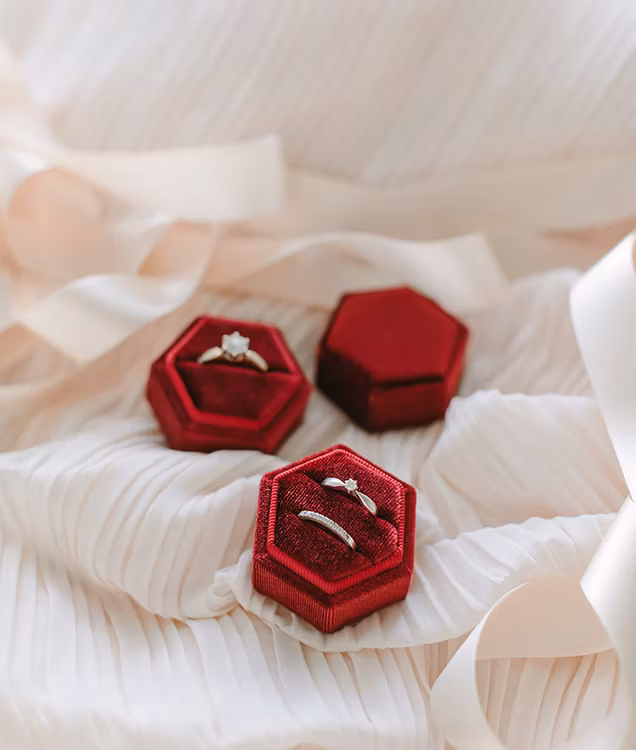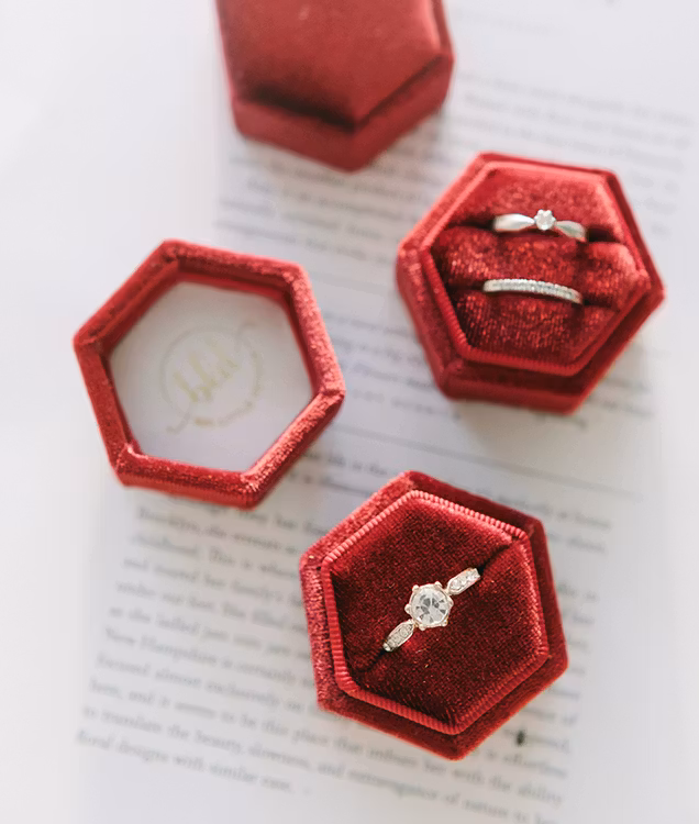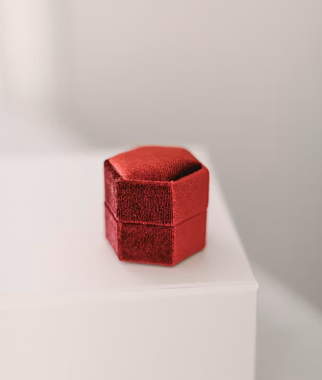 Handgjord ringask i röd sammet med ett eller två ringfack. Våra ringaskar är mindre än traditionella ringaskar för att framhäva din ring på bästa sätt. En vacker liten detalj för bröllop, förlovning eller present.